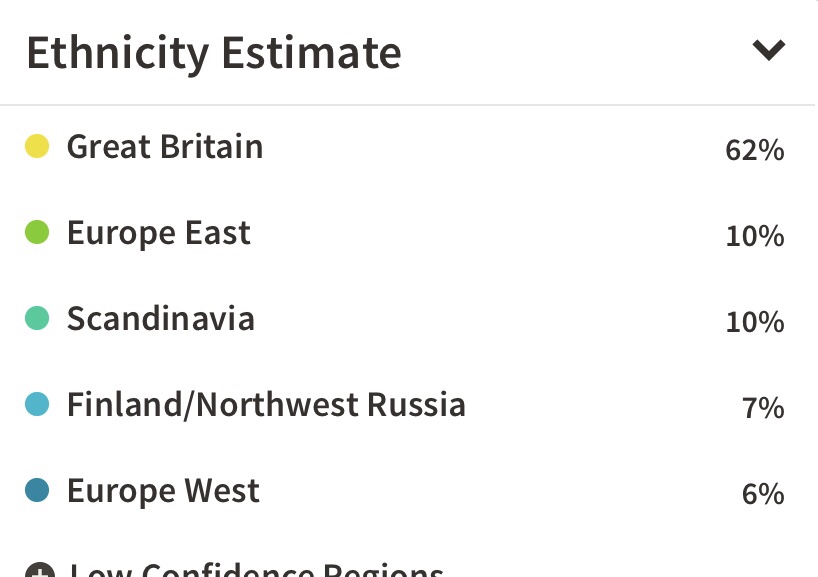 In terms of ethnicity, every company approaches it differently based on the data they’ve collected. You can see in the picture below that each company has different estimates for my ethnicity -clearly the accuracy is questionable. (Personally, based on what I know, I believe the National Geographic one to be the most accurate, although the region “Finland and Siberia” is sketchy). Regardless, even the most accurate ethnicity tests are not breaking down the results by country, but by more general regions. The newest test on the block, Living DNA, breaks the regions down the most of any DNA test, hence my interest in taking it. It would be nice to have my British DNA broken down a little further, but then, how much British DNA do I have, versus how much British DNA does an older member of my family have? Maybe it would be better to have my great-aunt take the test instead.