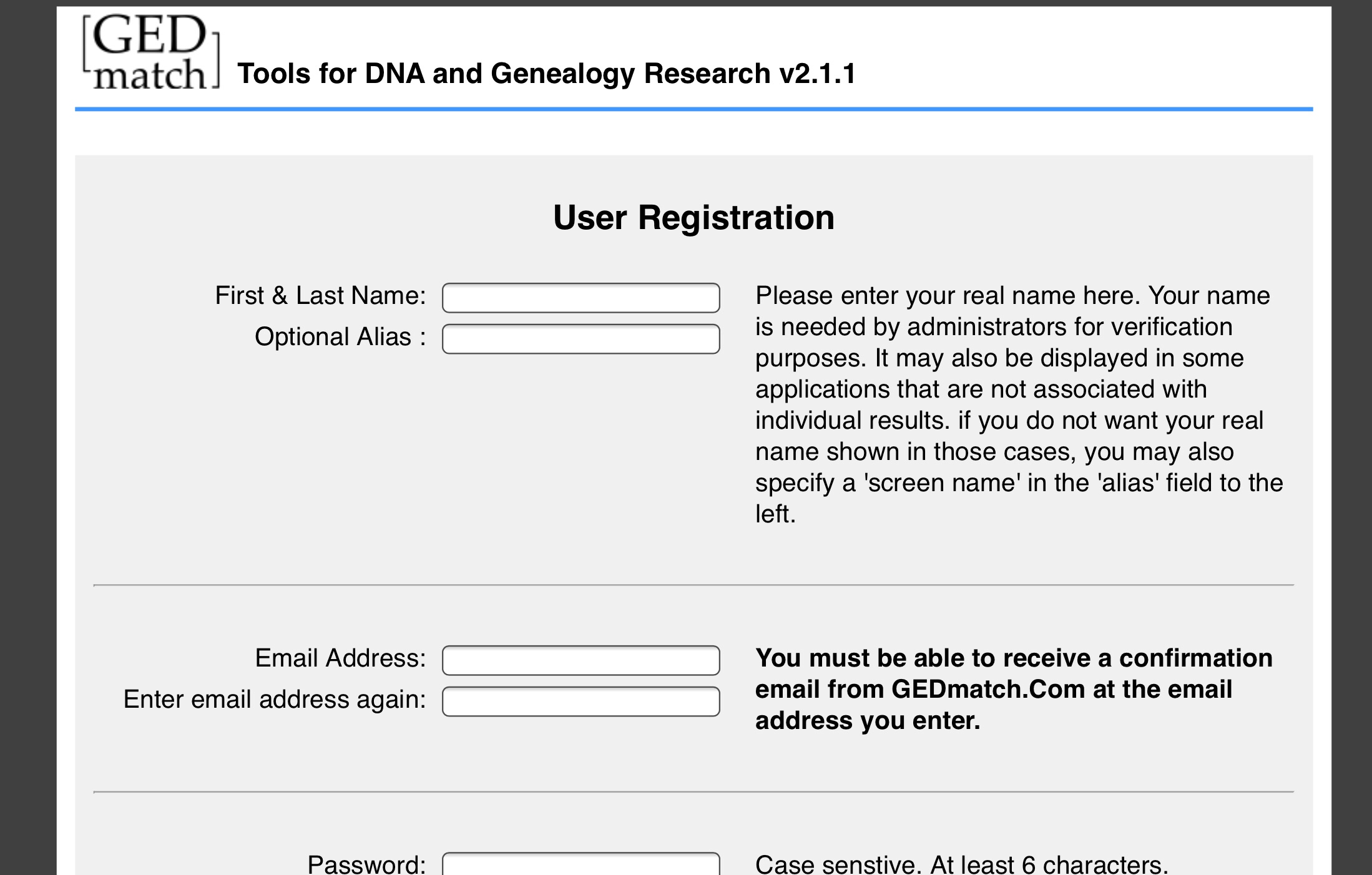 c) After filling in the registration page, you’ll be taken to the next page. Check your email for a confirmation code from Gedmatch, then put that code in the box. Once you hit “confirm,” you’re all ready to proceed to Step 2!