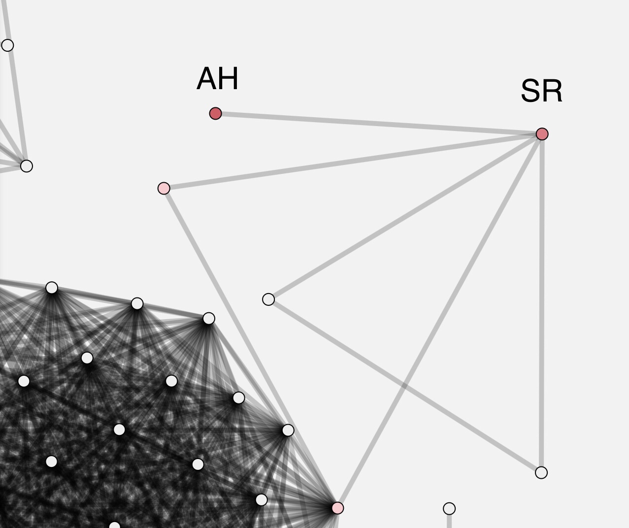 They say a picture is worth a thousand words, so here is a picture of my findings. Here is my distant cousin, A.H., represented by one pink dot, and my great-aunt S.R., represented by another pink dot. The lines connect matches who are related to each other in the same way. Sad, isn’t it? Despite all the DNA in common, there are no other users on Gedmatch who share this DNA with us.