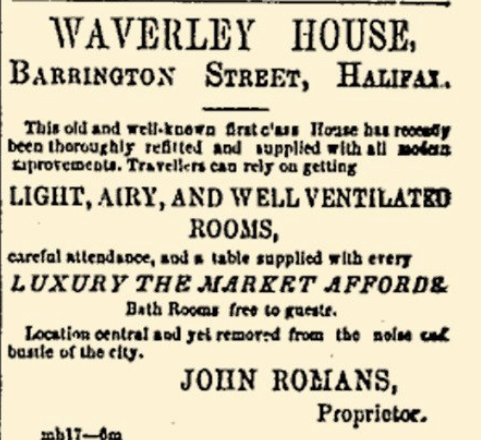 John Romans was the proprietor of Waverley House, a “well known and first class” boarding house (if the ads are to be believed). I have him on one census record and I have his death record, as well as in a handful of Halifax directories. If I ever get to Halifax, I can research probate and land records at the archives, but other than that, as he died in 1872, there isn’t much else to find on him during this time period. We don’t know how he came to be the owner of this hotel, and even if we find the land record showing the purchase of this property, it still doesn’t give us much detail about who John Romans was. Enter the newspapers.
