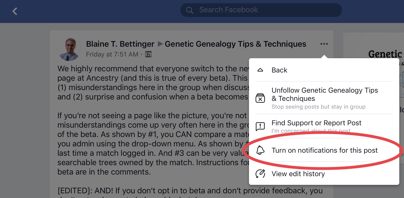 - Keep it on topic! If you’re posting in a genetic genealogy group, don’t post about traditional genealogy, and vice versa. Read the group rules to see what kinds of posts are allowed (recently all posts about the use of genealogy in law enforcement have been banned in the genetic genealogy group)