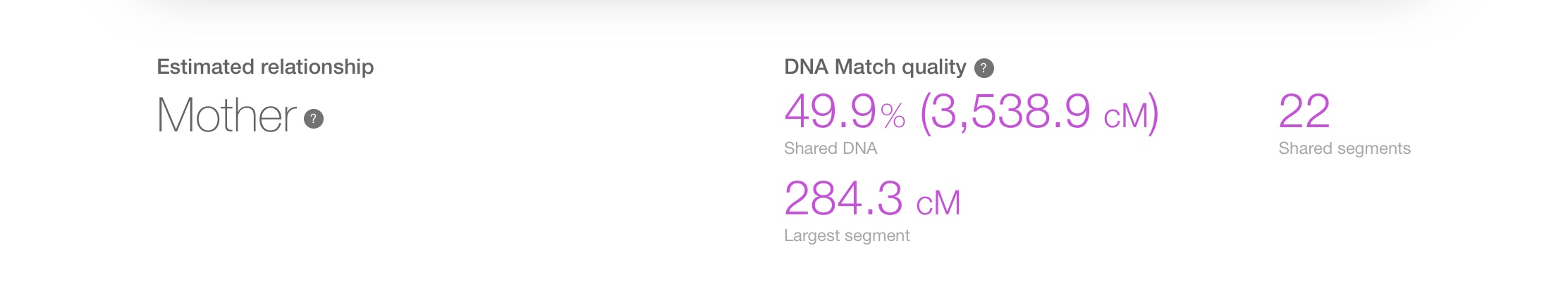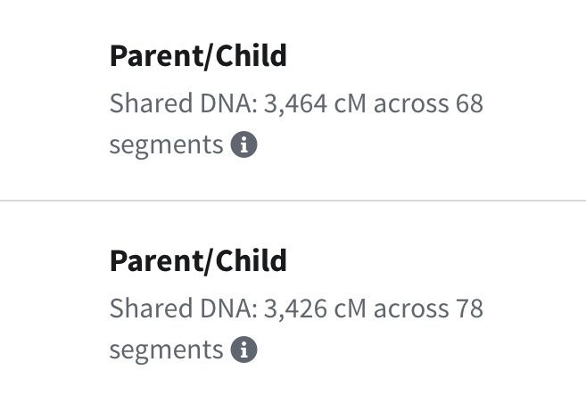 The DNA we share with someone is not one long chain, it’s broken up into pieces called segments. First, it is divided between our 22 autosomes, so at the very least it should come in 22 segments. However, since not every part of our DNA is tested (since it’s not useful at this point in time to do so, although there are companies that do it), it’s likely that we’ll share many segments with people. Unlike cM amounts, the amount of segments we share with people doesn’t currently have any hard and fast rules about how it relates to relationships. Presumably if you share a lot of segments with someone, you’ll also share a lot of cMs with them. But let’s imagine a scenario where you have 2 unknown DNA matches. You share the same amount of cMs with both of them but it’s split up into multiple segments for one person and one long segment for the other. It would make sense, especially if it’s a lot of cMs, that the one long segment is a closer relationship because over long periods of time these segments split up. However, we don’t have enough information at this time to know for sure whether or not the amount of segments is meaningful.
