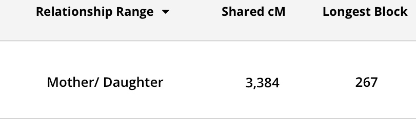 FamilyTree DNA doesn’t give you segment information, but they do include the size of the largest segment. You can use the chromosome browser (I talk more about the FTDNA chromosome browser here) to count the amount of segments you share, but keep in mind FTDNA counts very small segments. Read this post to find out why that’s a problem. You’ll also note that the amount of cMs I share with my mom differs from Ancestry. This is also normal, as each company has their own algorithms for figuring out what counts as shared DNA.