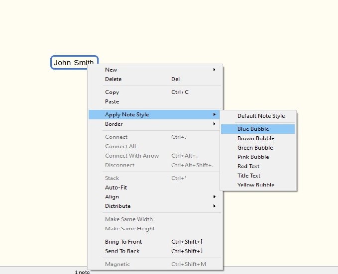 Step 1) Double click anywhere to create a “note” (basically a text box), which you can then edit. I started with John Smith. If you right click on the note “John Smith”, you will see and option to “Apply Note Style.” I made him in a blue bubble.