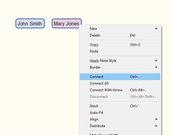 Step 2) I made John Smith’s wife, Mary Jones following step 1, but I made her bubble pink. Now to connect John and Mary. If you hold CTRL and click on each note, then right click, you’ll see “connect.”