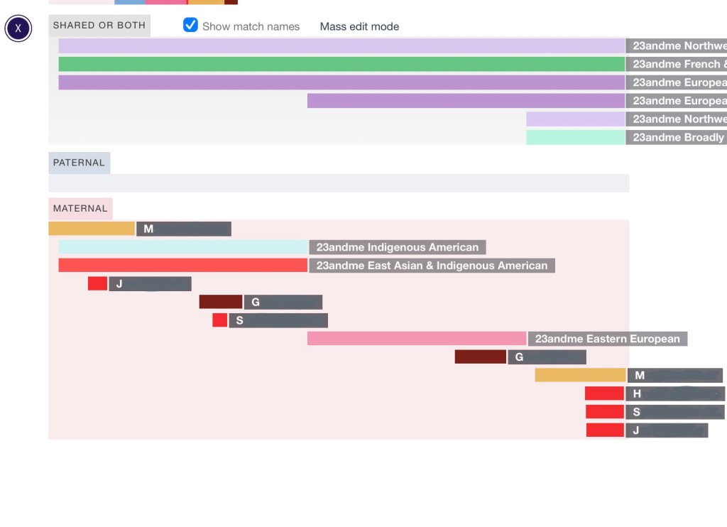 Here’s a snapshot of my ethnicity-painted X from 23&me. I’m kind of lucky in the sense that my Dad comes from an endogamous population and is fairly easy to identify. My mom’s DNA comes from a few different regions but those differences also make her parts easy to identify. Even though they haven’t tested at 23&me yet, I was able to figure out which X came from which parent. The yellow is indigenous, so I know it came from my mom’s dad, more specifically from his mother, whose ancestors worked for the Hudson’s Bay Company. The turquoise is Eastern European, which is from my half-Polish maternal grandmother, and the light blue is “broadly northwestern European.” This could have come from either maternal grandparent, but since I match with my grandfather’s cousin in that spot I was able to figure out that it came from my grandfather.