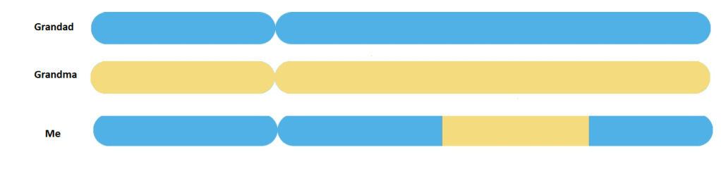 Remember this guy? He provides a catch-phrase for inferred matching. He calls his parents “Mama” and “Not-the-mama.” Similarly, I can refer to the blue parts of this chromosome as “Not-grandma” and the yellow part as “Not-grandad.”