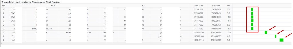 It’s fun to play around with this tool. I noticed I have a lot of triangulation groups, which isn’t surprising given that half my DNA comes from an endogamous population. When I ran my non-endogamous great-aunt’s triangulation, I was able to spot a pile-up region. (8) It really stood out since most of her triangulation groups were not very large, and then on one chromosome a group filled the entire page and then some.