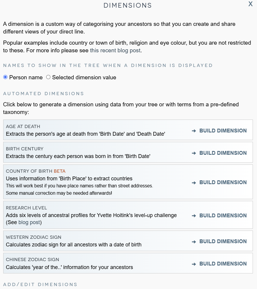 Another way to view your tree is through dimensions. These are ways of categorizing your ancestors such as age at death, birth century and country of birth. I especially like “Research Level,” dimension, which is based on Yvette Hoitink’s “Six Levels of Ancestral Profiles.” It allows you to see where you can “level up” your research.4