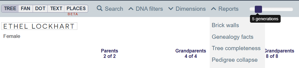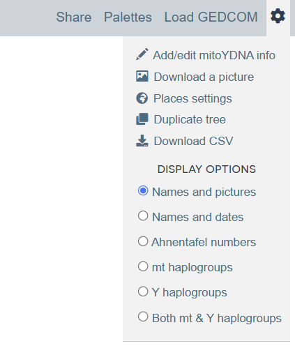 There’s a slider to adjust the number of generations you are viewing and you can change the colour palette. In the settings, you can toggle the mitochondrial DNA (mtDNA) and/or Y DNA haplogroups, or the Ahnentafel number, which gives each person in the tree a unique number.