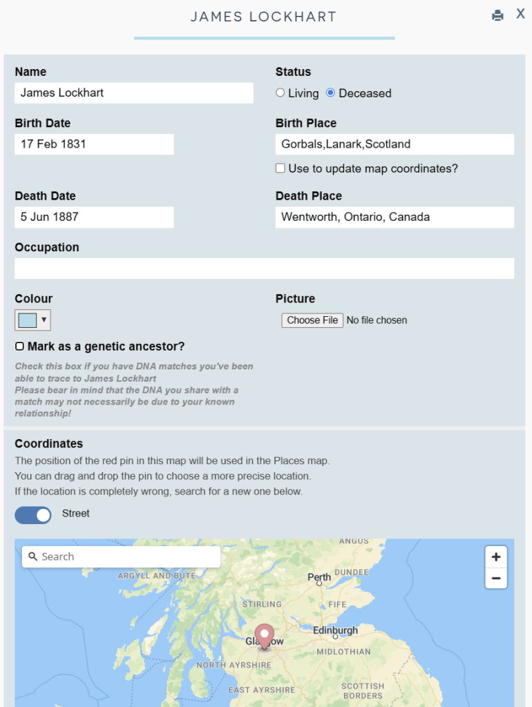 While you can easily create a tree from scratch, you can also upload a family tree file (GEDCOM). Once you have added a person to the tree, it is easy to edit any information, as well as add their YDNA and/or mtDNA haplogroup, and to mark them as a genetic ancestor.