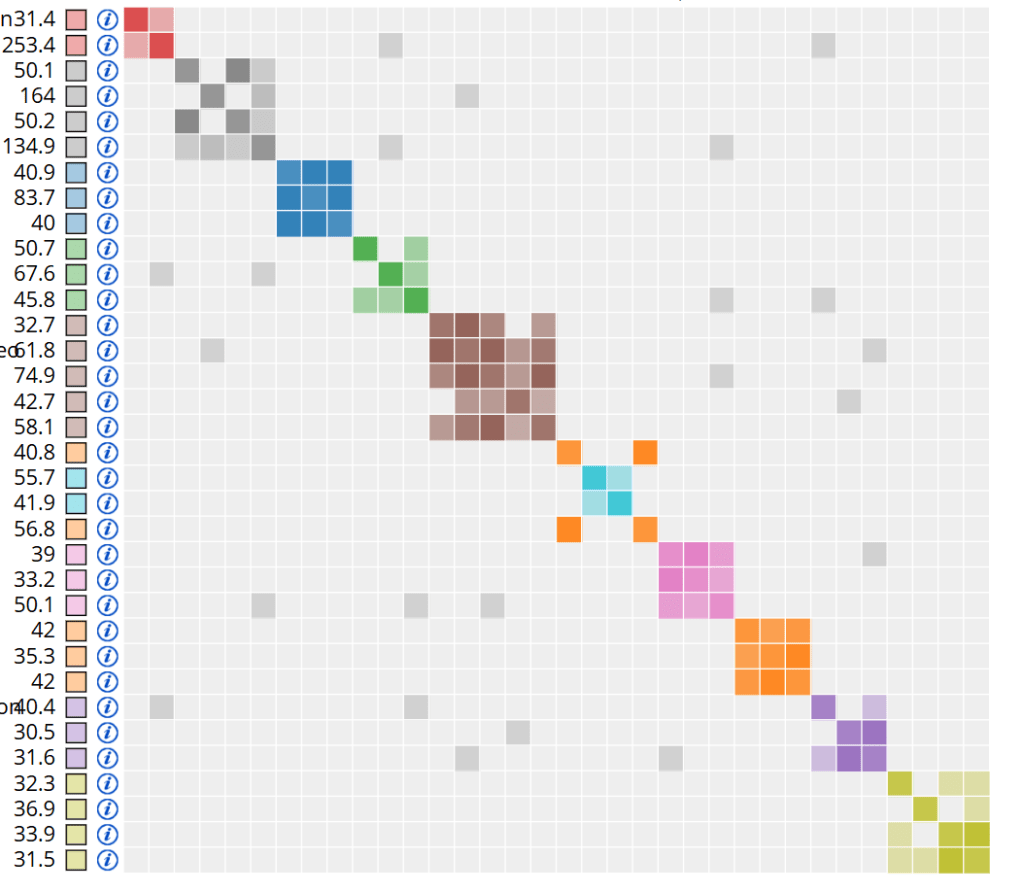 You’ll also notice some random smaller grey boxes. These boxes show overlap between two clusters: people in one cluster also share DNA with people in another cluster. Too much overlap means the clustering tool won’t be useful, because we want to have distinct genetic networks. Usually when too much overlap is an issue, you’ll end up with one giant cluster and a bunch of really small ones, with a ton of small grey boxes. Here the overlap is very mild.