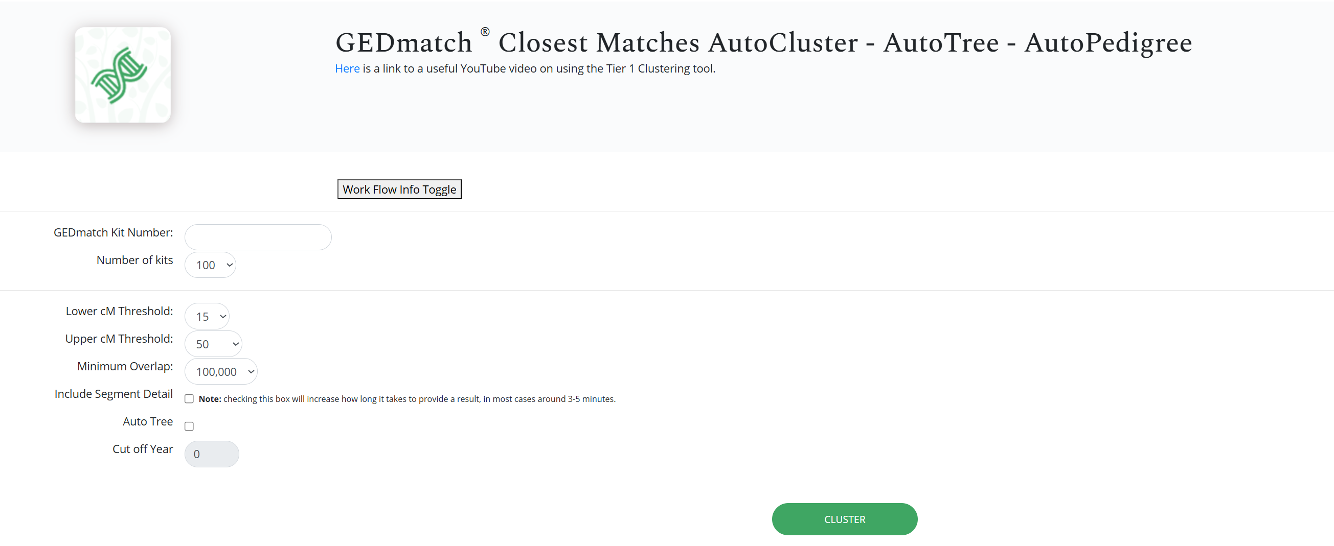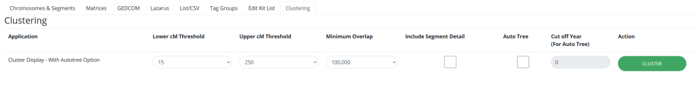 Now all you need to do is pop in your kit number and adjust the settings to your liking. I like to raise the number of kits, because that will likely lead to more and/or bigger clusters. In terms of the centiMorgans threshold, the lower threshold is the minimum amount of centiMorgans that a match must have to be considered. The upper threshold is the highest amount of centiMorgans a match can have. I don’t change the overlap, nor do I include segment detail, and I’ll briefly talk about Auto Tree later. The cut off year has to do with the Auto Tree feature.