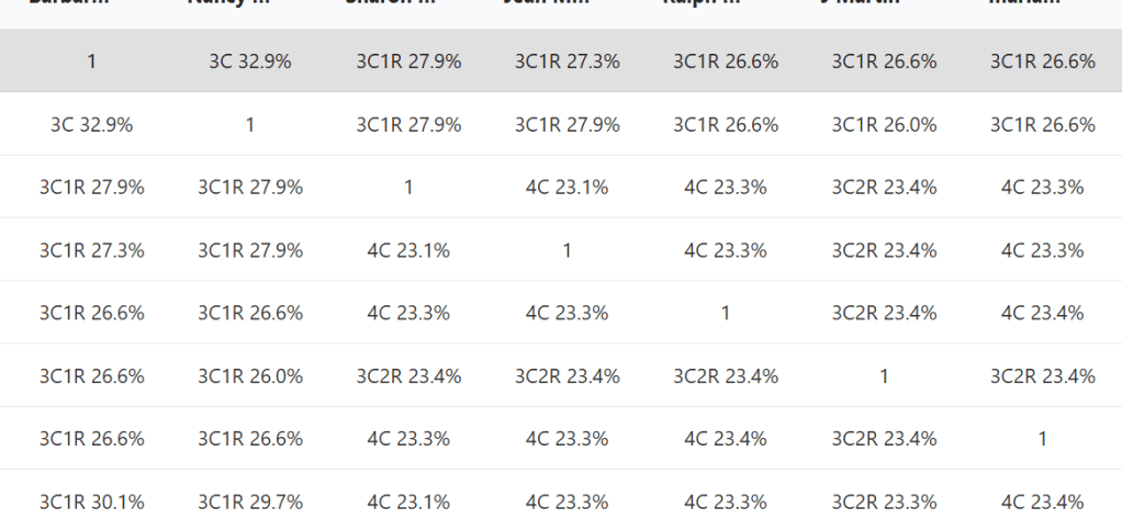 Underneath the ranked list, you will see a matrix which shows the amount of DNA each match shares with every other match. In addition, you can download a relationship matrix. Another way to see the relationship matrix is to open the tree in a new tab from the ranked list.