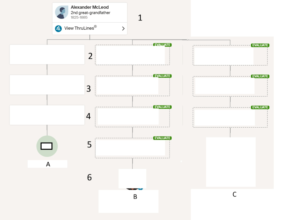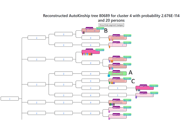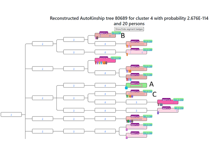 In the AutoKinship Tree, Match A and C are in generation 5, and match B is in generation 4. Match A and B were given the relationship of second cousin once removed (2C1R). Match A and C were given the relationship of second cousin (2C). Match B and C were given the relationship of second cousin once removed (2C1R).
