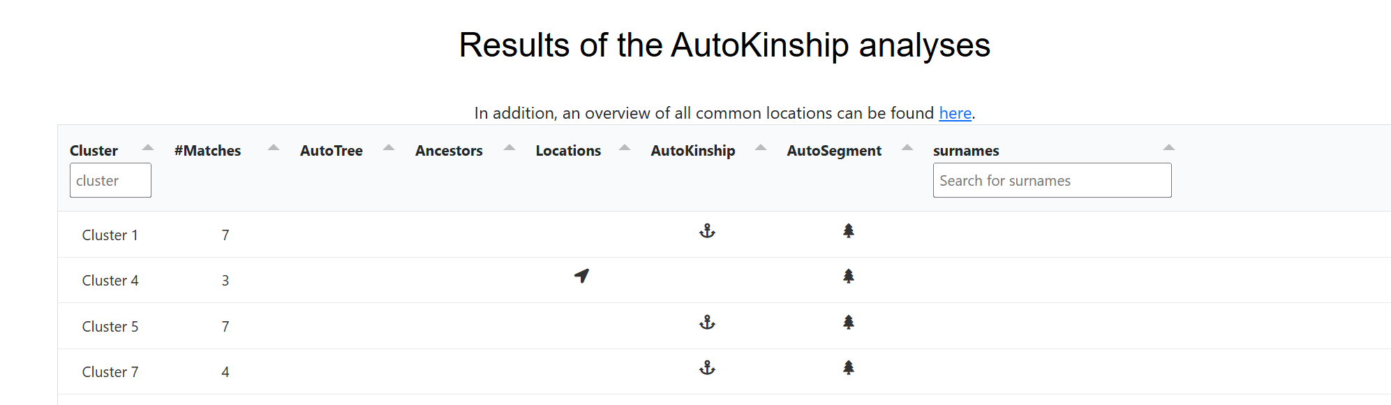 The AutoKinship file starts off with the now familiar clusters, followed by table of clusters with links for each cluster for AutoTree, ancestor names, and locations (if available), AutoKinship, AutoSegment (5), and surnames.