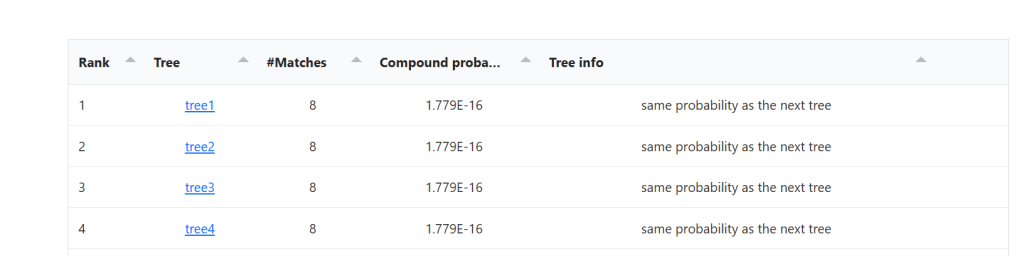 Underneath the tree is a ranked list of trees, and the tree info compares the probability of that tree being the correct tree as compared to the tree below it. The first tree is the same as the tree at the top of the page, but if you click on it, it will open in a new tab.